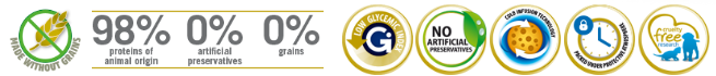 Pollo deshuesado (28%), proteína de pollo deshidratada (27%), batata, grasa de pollo, huevo deshidratado, arenque, proteína de arenque deshidratada, aceite de pescado (de arenque), fibra de guisante, zanahorias deshidratadas, harina de alfalfa, cartílago de pollo (fuente de glucosamina y sulfato de condroitina), inulina, fructo-oligosacáridos, extracto de levadura (fuente de manno-oligosacáridos), granada deshidratada (0. 5%), manzana deshidratada, espinacas deshidratadas, cáscaras y semillas de psilio (0,3%), naranja dulce deshidratada, arándanos deshidratados, cloruro de sodio, levadura de cerveza deshidratada, cúrcuma (0,2%), extracto de aloe vera.