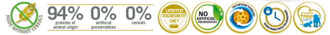 salmón (carne mecánicamente separada de salmón, harina de salmón – mín. 8%), harina de pescado, harina de vísceras de aves, harina de torrezno, huevo en polvo, almidón de papa, almidón de mandioca, aceite de pescado, aceite de pollo, pulpa de remolacha, cáscara de guisante, alfalfa deshidratada, celulosa en polvo, lignocelulosa, semilla de psyllium, levadura seca de cervecería, melón deshidratado (mín. 0,1%), zanahoria deshidratada, espinaca deshidratada, naranja deshidratada, manzana deshidratada, extracto de arándano, extracto de granada, extracto de té verde, extracto de aloe vera, cúrcuma en polvo, beta caroteno, aditivos prebióticos (FOS y MOS), DL-metionina, taurina, L-carnitina, sulfato de condroitina, sulfato de glucosamina, aditivos adsorbentes (extracto de yucca y zeolita), hidrolizado de pescado, vitaminas (retinol (A), colecalciferol (D3), acetato de DL-alfa-tocoferol (E), tiamina (B1), riboflavina (B2), clorhidrato de piridoxina (B6), cianocobalamina (B12), ácido ascórbico monofosfato (C), biotina, niacina, ácido pantoténico, ácido fólico, cloruro de colina), cloruro de potasio, hierro aminoácido quelato, cobre aminoácido quelato, zinc aminoácido quelato, manganeso aminoácido quelato, proteinato de selenio, yodato de calcio, propionato de calcio, concentrado de tocoferoles.