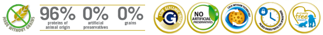 Humedad (máx.) 90g/kg (9%); Proteína Bruta (mín.) 300g/kg (30%); Extracto Etéreo (mín.) 180g/kg (18%); Fibra Bruta (máx.) 35g/kg (3,5%); Materia Mineral (máx.) 78g/kg (7,8%); Calcio (mín.) 8.000mg/kg (0,8%); Calcio (máx.) 15g/kg (1,5%); Fósforo (mín.) 7.000mg/kg (0,7%); Sódio (mín.) 2.000mg/kg; Potasio (mín.) 5.000mg/kg; Magnésio (mín.) 900mg/kg; Omega 6 (mín.) 20g/kg; Omega 3 (mín.) 5.000mg/kg; DHA (mín.) 1.500mg/kg; EPA (mín.) 1.200mg/kg; Taurina (mín.) 1.000mg/kg; L-Carnitina (mín.) 100mg/kg; Metionina (mín.) 5.000mg/kg; Lisina (mín.) 11g/kg; Sulfato de Glucosamina (mín.) 500mg/kg; Sulfato de Condroitina (mín.) 300mg/kg; Manano-Oligosacáridos (mín.) 240mg/kg; Fructo-Oligosacáridos (mín.) 700mg/kg.